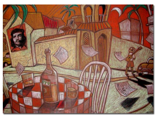 Ganz zweifellos bedeutet dieses Gemälde meinen Durchbruch in der Riege der verhinderten Impressionisten. Zugleich ist es ein Paradebeispiel für geschicktes product-placement einer von mir erdachten Rum-Sorte. Besonders stolz bin ich auf das Portrait von Che Guevara.