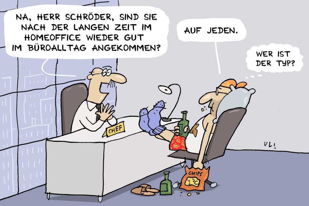 …und zwar das Ende vom Homeoffice. Viele von uns dürfen bald wieder zurück in das eigentliche Wohnzimmer, das Büro. Endlich Chef und Kollegen wieder live erleben!