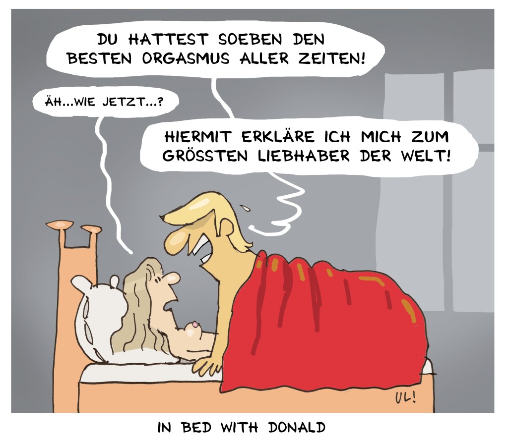 Cartoons In bed with… Datum: 5. November 2020Autor: uliwood 2 Kommentare 5. November 2020. Ich finde ja, das hier fasst das Wesen von Mr. Trump ganz gut zusammen. Und ich hoffe sehr, dass es der letzte Cartoon ist, den ich über ihn machen „muss“. Auf das wir ihn vergessen dürfen… Teilen mit: Klicke, um auf X zu teilen (Wird in neuem Fenster geöffnet) X Klick, um auf Facebook zu teilen (Wird in neuem Fenster geöffnet) Facebook Klicken, um einem Freund einen Link per E-Mail zu senden (Wird in neuem Fenster geöffnet) E-Mail Gefällt mir Wird geladen … Ähnliche Beiträge